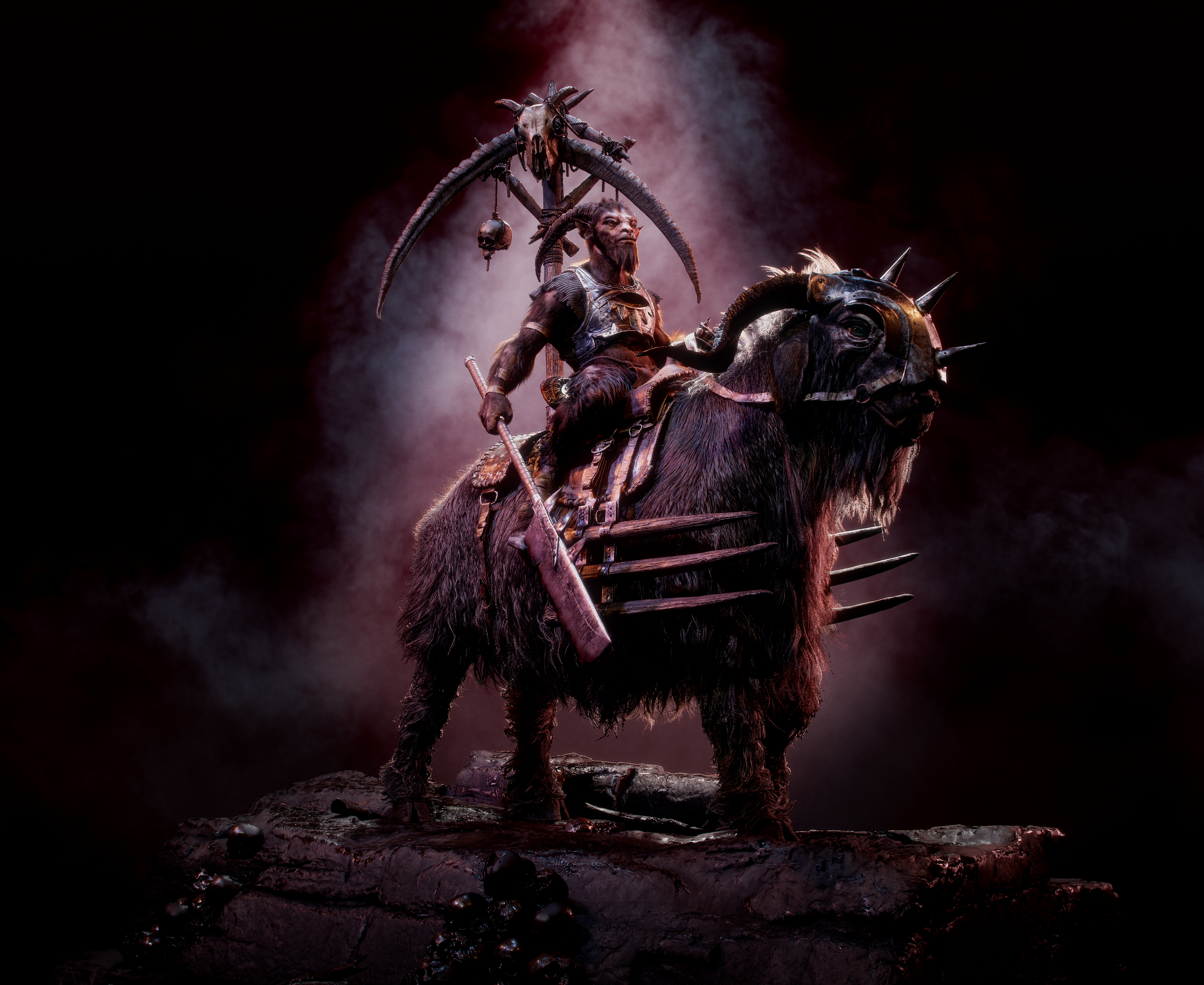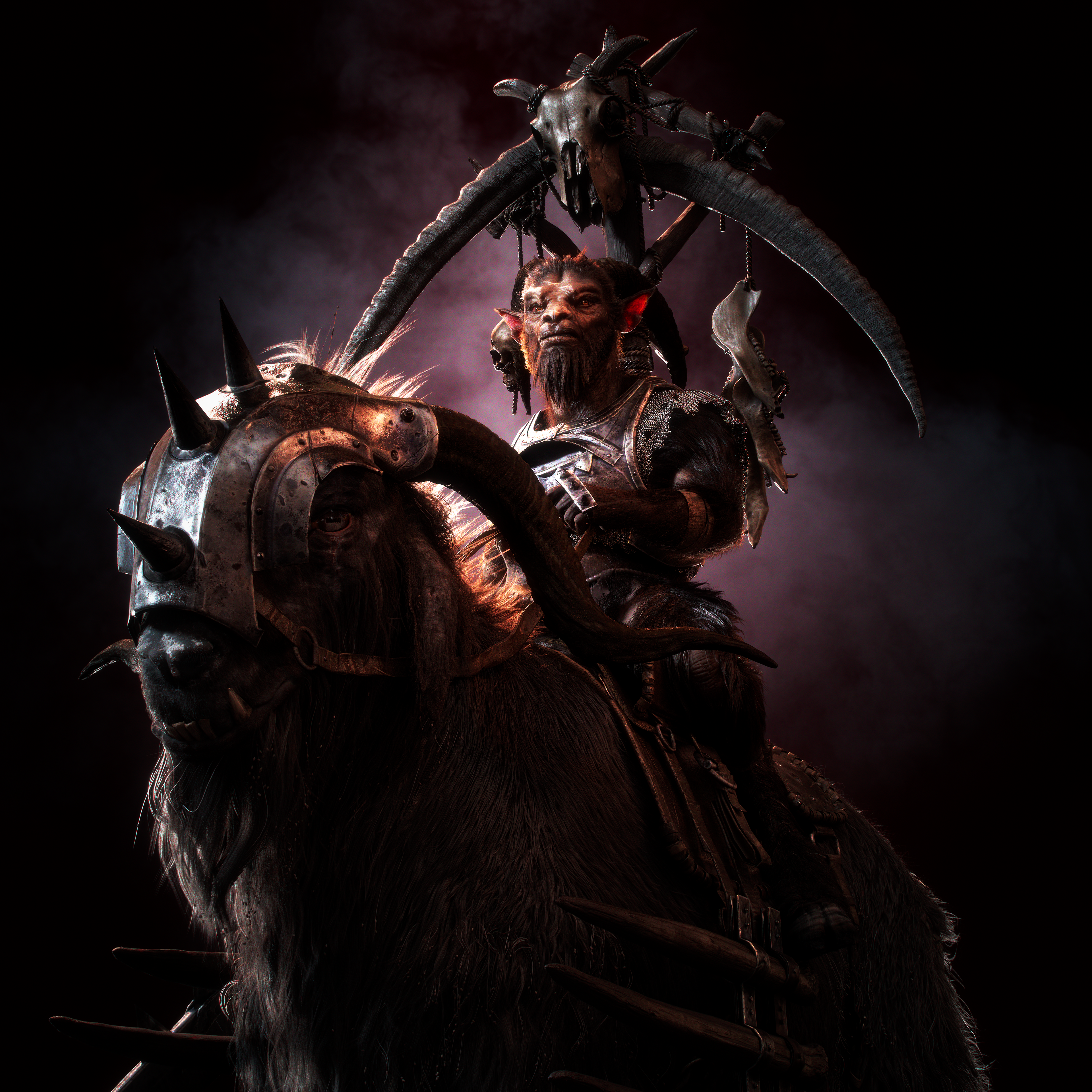 This piece was inspired by Stefan Kopinski’s “Bruchaath and Big Goat” and brought to life through a collaborative workflow between two artists. Our goal was to translate the painterly brutality and imposing energy of the original artwork into a cinematic 3D interpretation. Under the mentorship of Miguel Ortega, we approached this project as if it were part of a production pipeline, combining strong design, believable materials, and narrative presence. Ryan Donnahoe focused on sculpting and hard-surface elements, while I handled grooming, texturing, and look development. We pushed for realism and storytelling through light, texture, and composition. This collaboration taught us how to manage complex multi-asset workflows, maintain artistic consistency between different areas of responsibility, and deliver a polished, cohesive final image. It was a challenging but incredibly rewarding experience that deepened our understanding of cinematic character creation.
